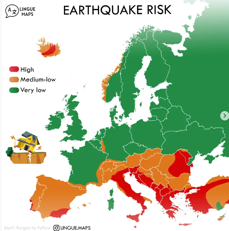 Профилот „Lingue Maps“ објави нова мапа на Европа која го прикажува проценетиот сеизмички ризик по региони, категоризиран во три зони:висок...