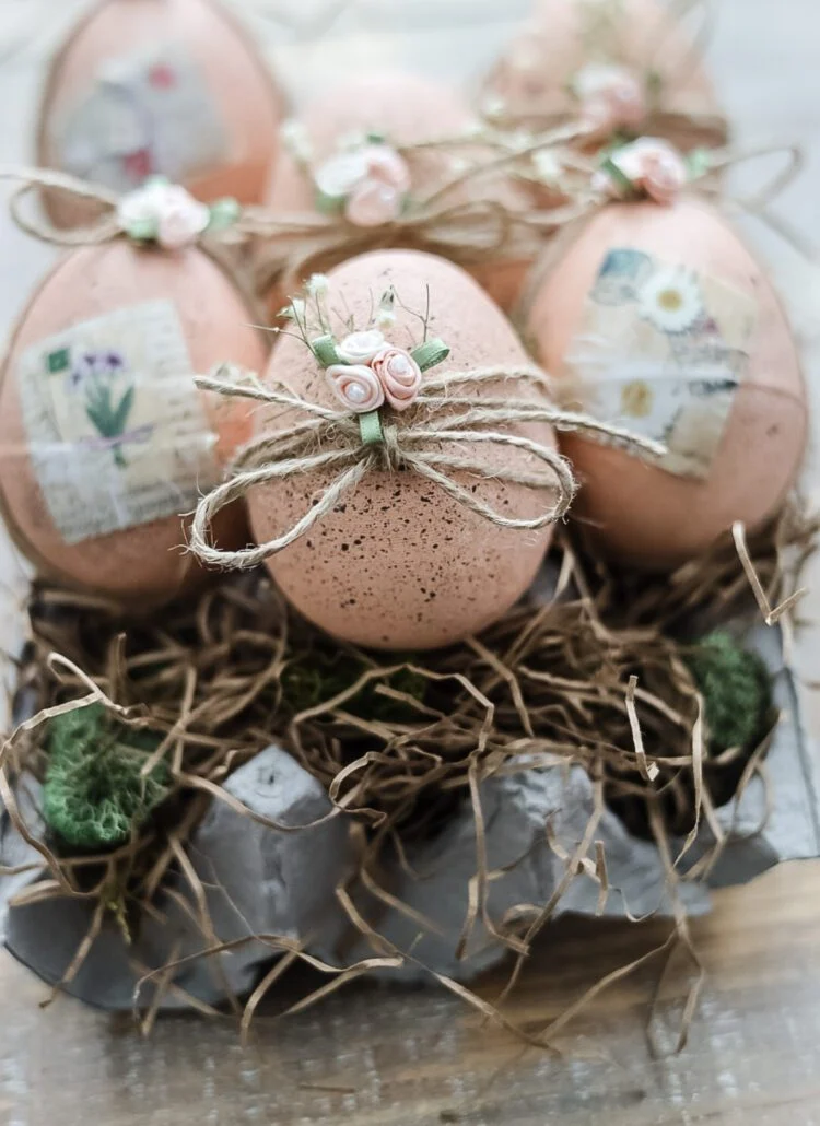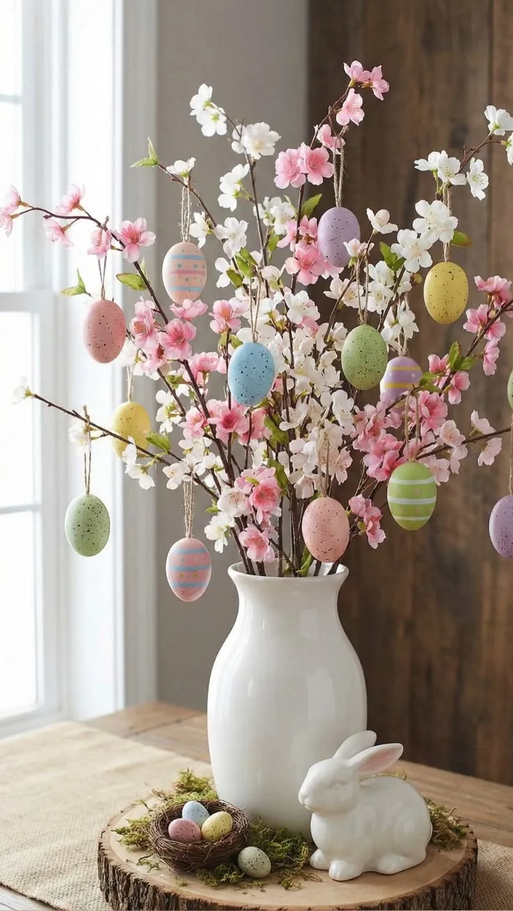 Ставете неколку подолги гранки во голема вазна. На нив закачете неколку суптилни дрвени украси во форма на јајца.