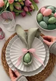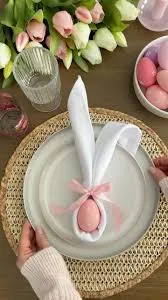 Не ви требаат специјални украси. Земете обична платнена салфетка, свиткајте ја во ролна, преклопете ја на половина и врзете ја со конец за да направите „уши“. Во средината ставете едно јајце. Вашите гости ќе бидат воодушевени од овој мал, но креативен гест.